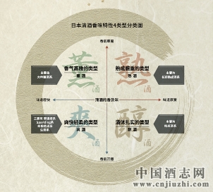 我們先來了解一下日本酒的四大分類。此分類法以日本酒的“香氣”表現(xiàn)與“味道”(特別是鮮味)表現(xiàn)作為基礎(chǔ),依據(jù)表現(xiàn)的強與弱分為“薰酒”、“爽酒”、 “醇酒”、 “熟酒”;方便消費者輕松理解和想象酒款的口味。